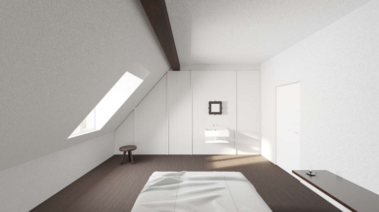 V sobe bodo umestili tudi novo kopalnico, ki bo skrita za belo leseno steno. Na steni boste umivalnik in ogledalo, ki bosta del glavnega spalnega prostora.