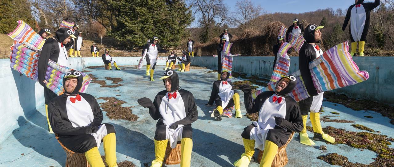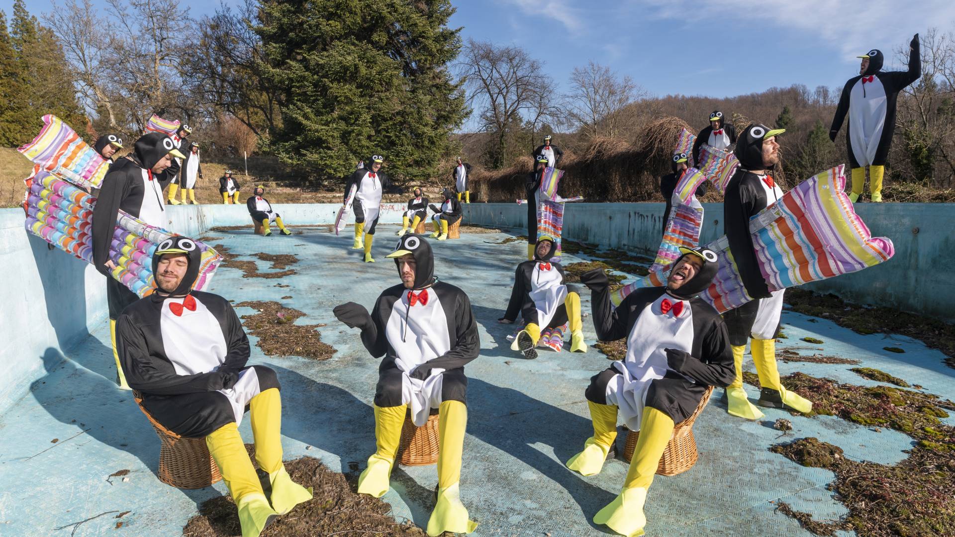 Letošnji pust pa je borlskemu bazenu vendarle vrnil nekaj življenja, saj je v njem osvežitev, resda zaman, iskala cela kolonija pingvinov. Za vseh dvajset živali je poziral kar sam fotograf Sandi Kelc, ki se je za tovrstno pustno norčijo tokrat odločil že drugič.