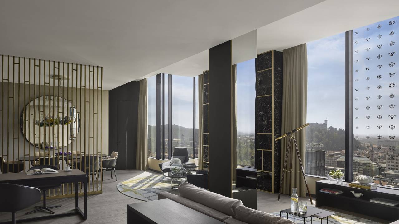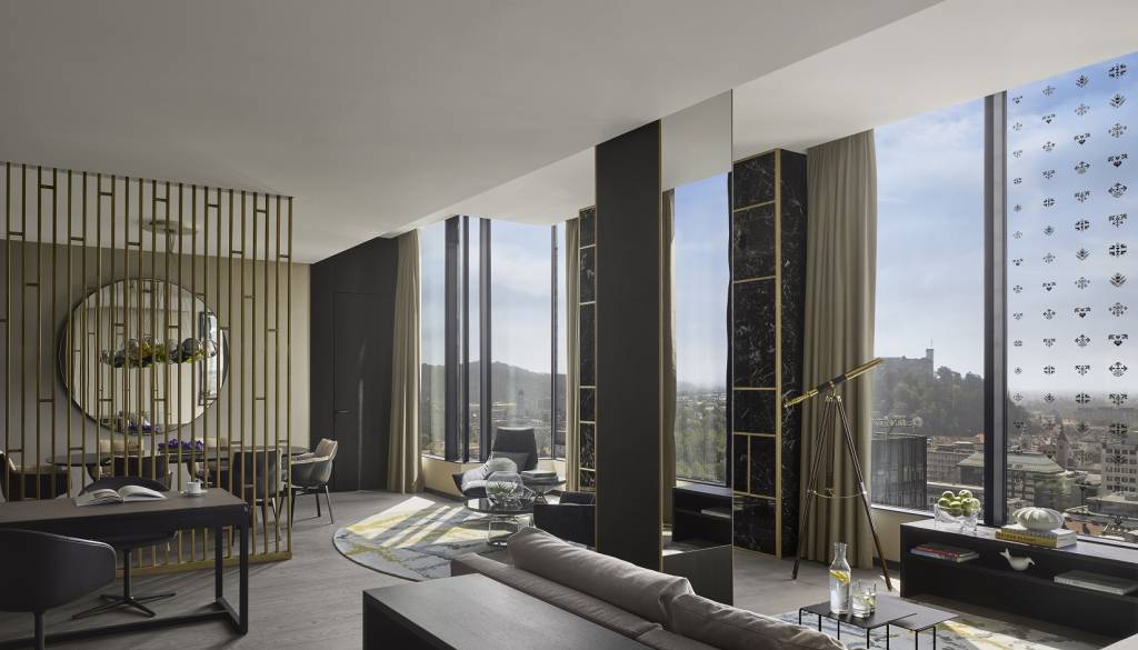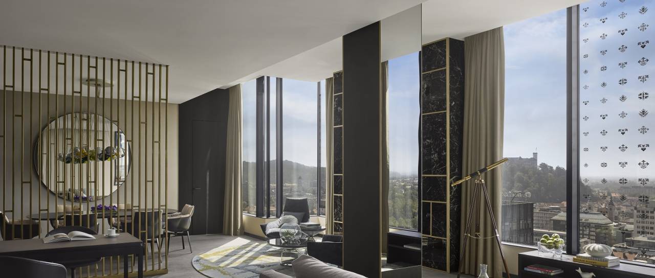 Predsedniški apartma se nahaja v predzadnjem, 19. nadstropju in je zato najvišjeležeči apartma v Ljubljani. Ponuja čudovit razgled na mesto. V vseh prostorih apartmaja se prepletajo detajli Ljubljane, kot so njene abstraktne zračne linije in zemljevid mestnega parka Tivoli.