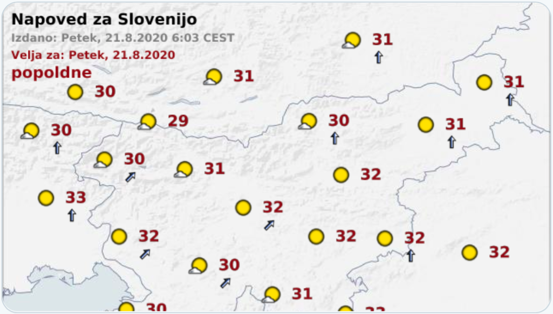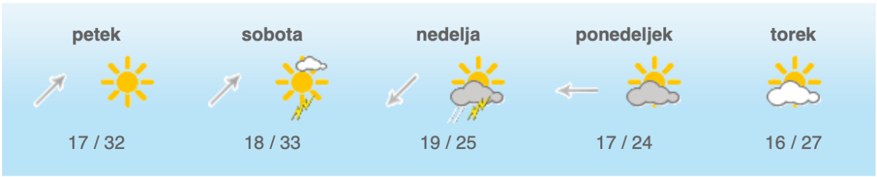 Jutri bo pretežno jasno. Proti večeru bodo na severu nastale prve nevihte, ki se bodo v noči na nedeljo razširile proti jugu. Najnižje jutranje temperature bodo od 13 do 18, na Primorskem okoli 20, najvišje dnevne od 30 do 34 stopinj Celzija.