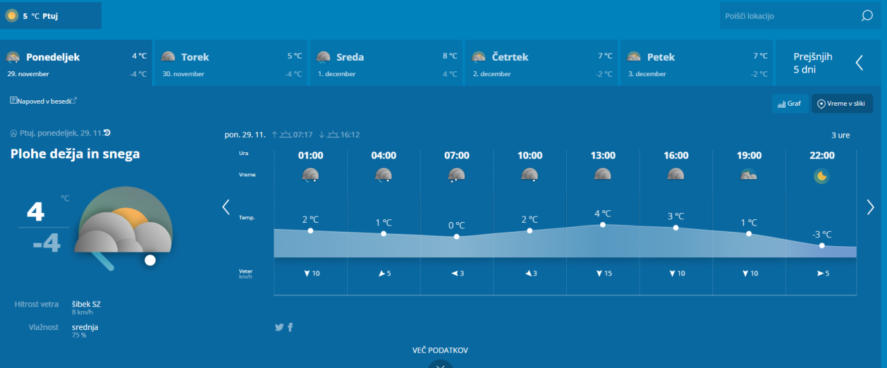 Najvišje dnevne temperature bodo od 3 do 7, na Primorskem do 12 stopinj Celzija.