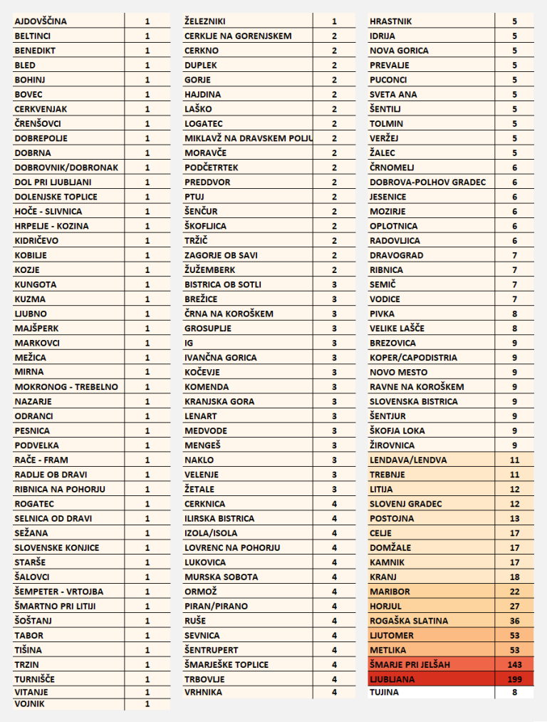 Kot poroča Nacionalni inštitut za javno zdravje je znova nekoliko naraslo število pozitivnih v Šmarju pri Jelšah, in sicer s 137 na 143. Rast beležijo tudi v občini Ljutomer, kjer je okuženih že toliko kot v Metliki. V vrhu ostaja Ljubljana s skoraj 200 potrjenimi okužbami.