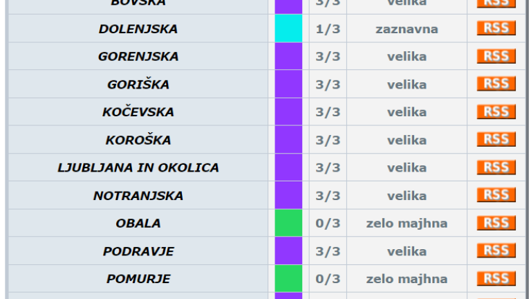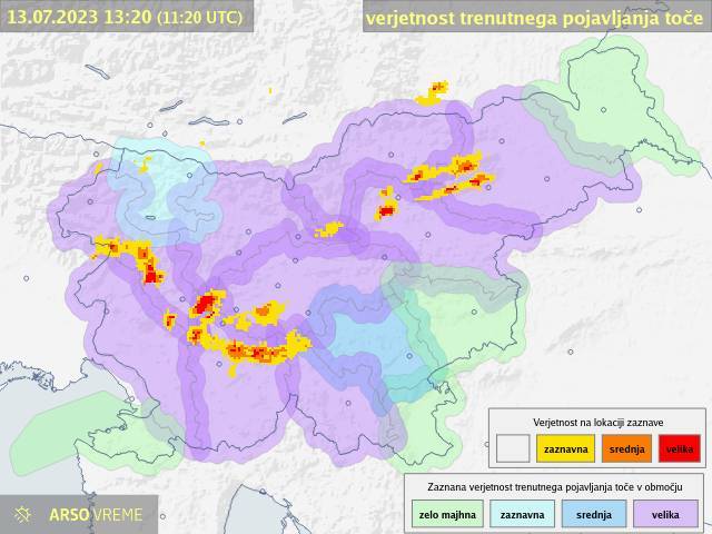 Agencija Republike Slovenije za okolje je za Bovško, Gorenjsko, Goriško, Kočevsko, Koroško, Notranjsko, Podravje, Savinjsko in Ljubljano z okolico izdala vijoličasto opozorilo za veliko verjetnost trenutnega pojavljanja toče.