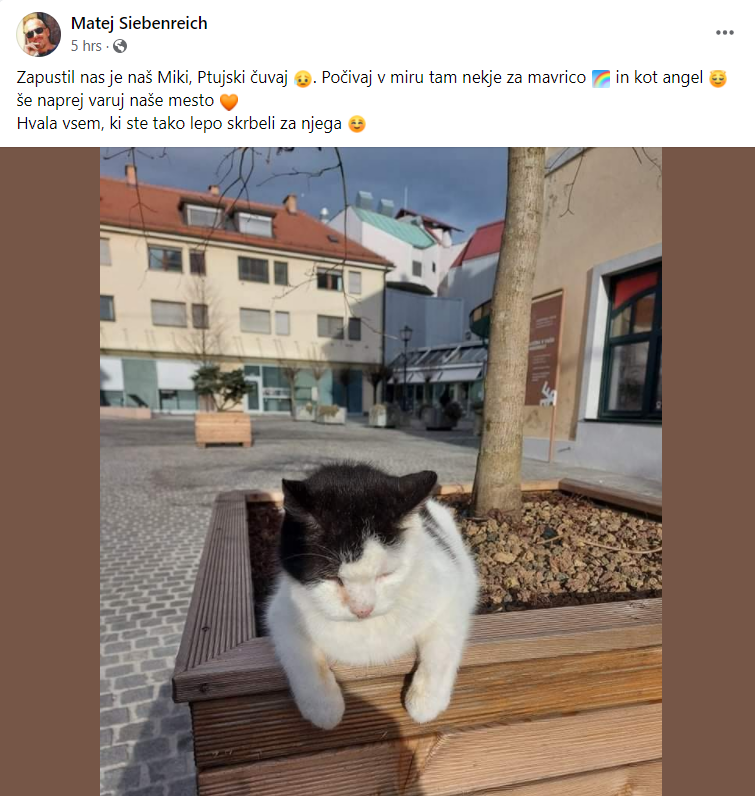 »Hvala vsem, ki ste tako lepo skrbeli za njega,« je v objavi v Facebook skupini Ptuj - moje mesto zapisal mestni svetnik Matej Siebenreich.