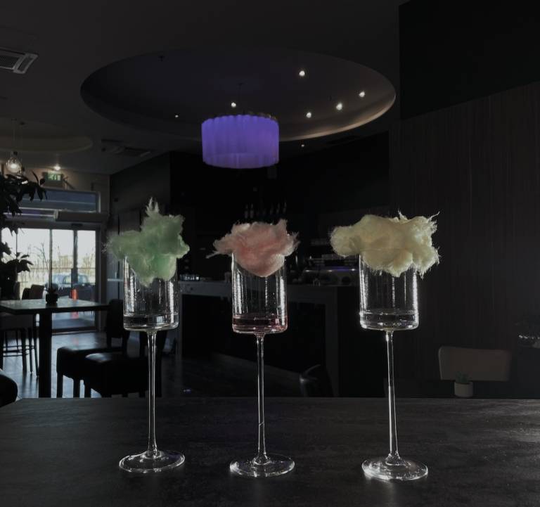 Pohvalila sta se tudi s tem, da imata izjemno široko ponudbo. Od velikega nabora vin, do penin, viskijev, kar štirideset vrst žganja, dvanajst vrst vročih čokolad, posebna atrakcija pa so koktejli gin tonik s sladkorno peno, ki se raztopi pred vami.