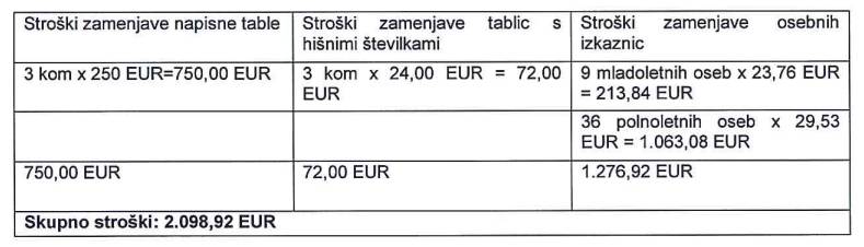 Občina bo krila tudi stroške prve zamenjave dokumentov stanovalcem Rabelčje vasi 29 b, c in d, ki imajo od dneva uveljavitve odloka prijavljeno stalno prebivališče na tem naslovu.