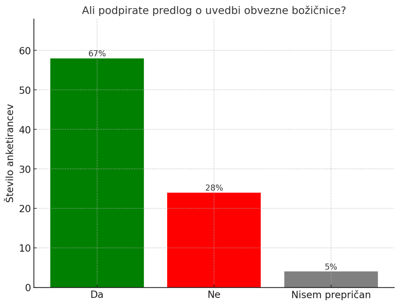V anketi je sodelovalo 86 anketirancev oziroma bralcev. 58 anketirancev oziroma 67 odstotkov se s predlogom uvedbe obvezne božičnice strinja.