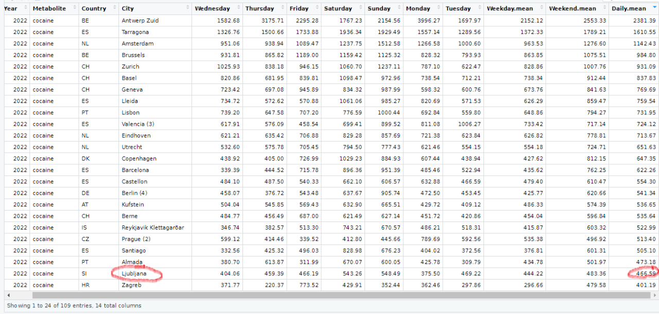 »Ljubljana, s 250 tisoč prebivalci, porabi 300 kilogramov kokaina na leto. To je ugotovila evropska agencija za kontrolo odpadnih voda. Ljubljana, z 250 "jurji" - toliko kot eno predmestje Pariza - se uvršča na tretje mesto, za Amsterdamom in Benetkami, po količini kokaina v odpadnih vodah.«