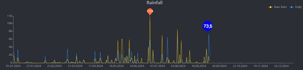 Samo v enem dnevu, 12. septembra 2024, od 0:01 do 23:59 (modra črta na grafu), je padlo neverjetnih 73,5 milimetrov dežja.