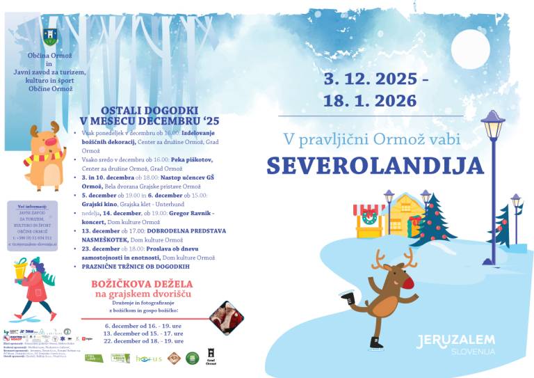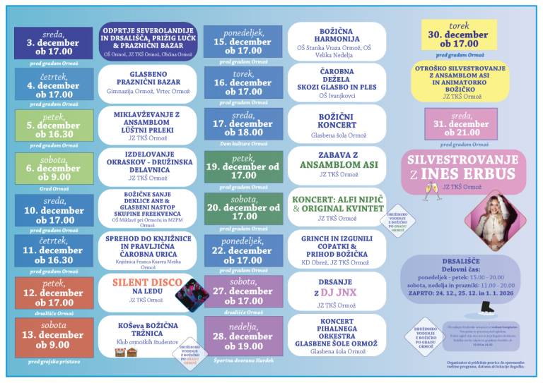 Praznično dogajanje pred gradom, v Domu kulture Ormož in na grajskem dvorišču prinaša številne koncerte, delavnice, nastope, družinske dogodke in zabavo na drsališču.