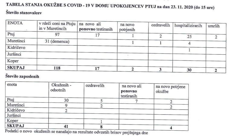 Včeraj, 23. novembra 2020, pa so bile okužbe potrjene pri 148 stanovalcih in 41 zaposlenih.