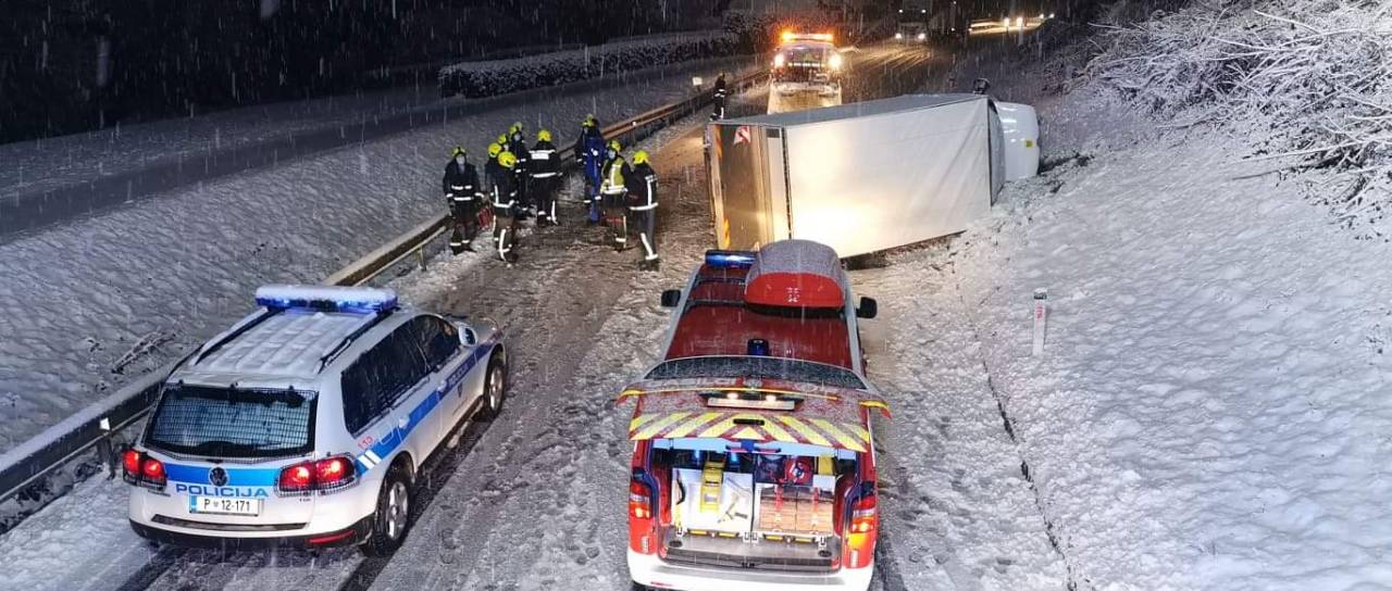 Po poročanju Uprave Republike Slovenije za zaščito in reševanje se je ob 4.43 se je na cesti Radlje ob Dravi - Dravograd v občini Muta prevrnilo kombinirano vozilo.