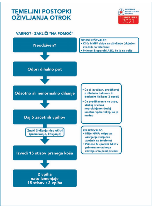 Kljub vsemu pa je potrebno, da smo pripravljeni na najhujše. V spodnjem prikazu si oglejte smernice temeljnih postopkov oživljanja otrok.