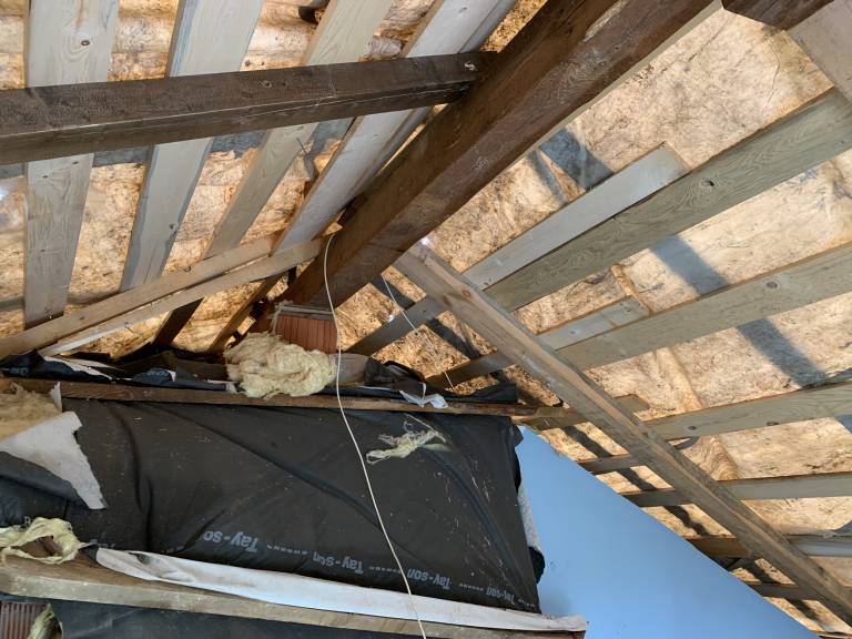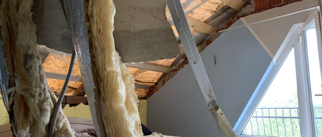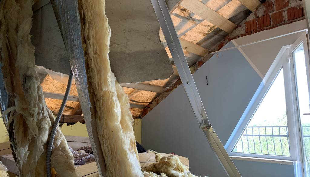 Neurje je s strešno kritino odneslo tudi izolacijo in mavčne plošče s konstrukcijo. Kopalnica, spalnica in otroška soba so tako brez stropa. K sreči v trenutku neurja osemletnega otroka ni bilo v svoji sobi.