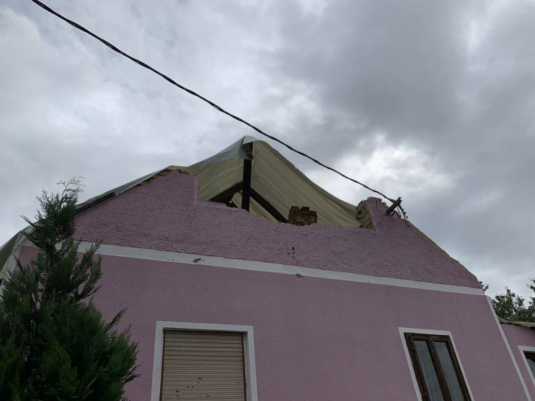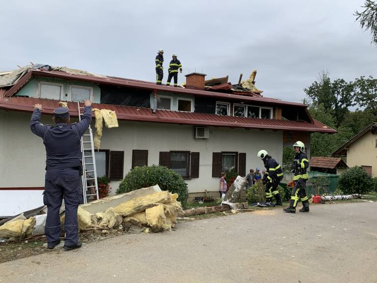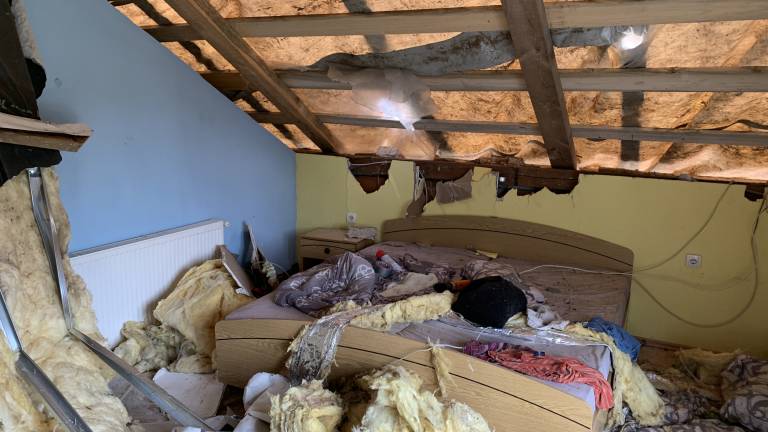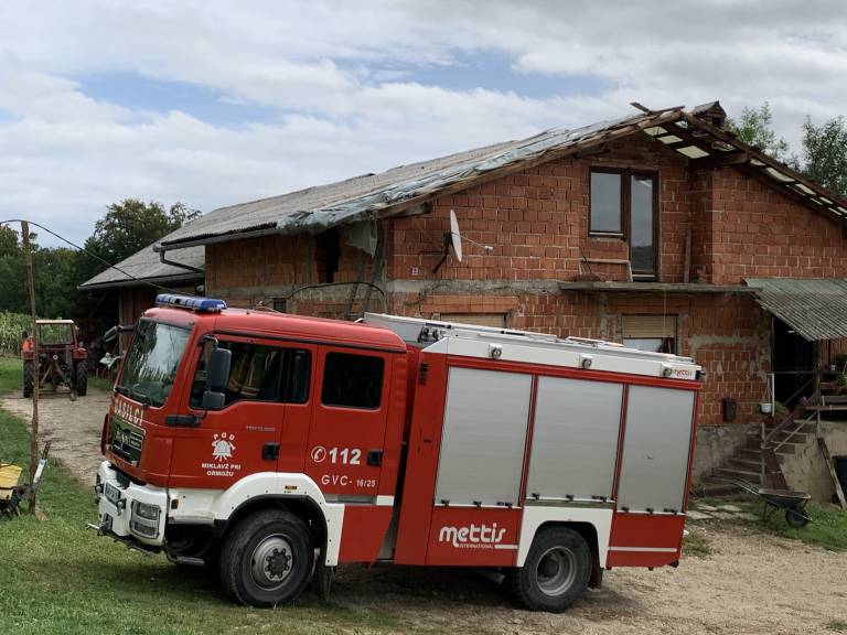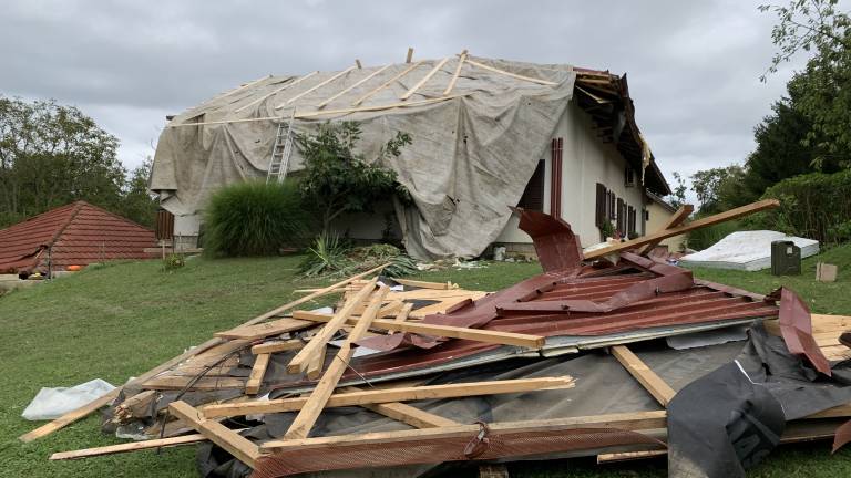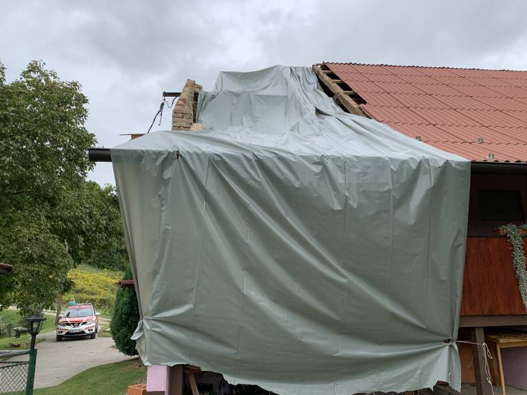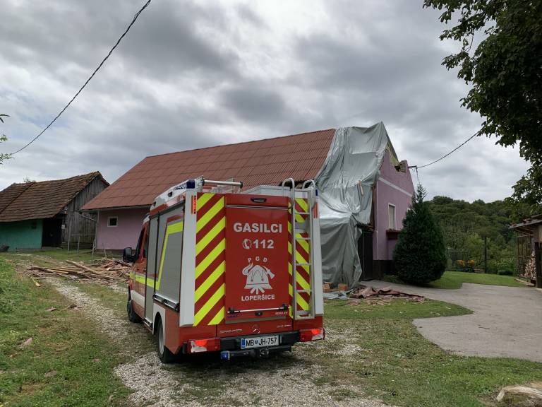 Družina Zadravec je danes dopoldne s solzami v očeh pospravljala razdejanje okoli svoje hiše v Hermancih. Orkanski veter je streho dobesedno odnesel s hiše. Začasno so hišo včeraj s pomočjo gasilcev pokrili s cerado, danes pa še dodatno z zaščitno folijo.