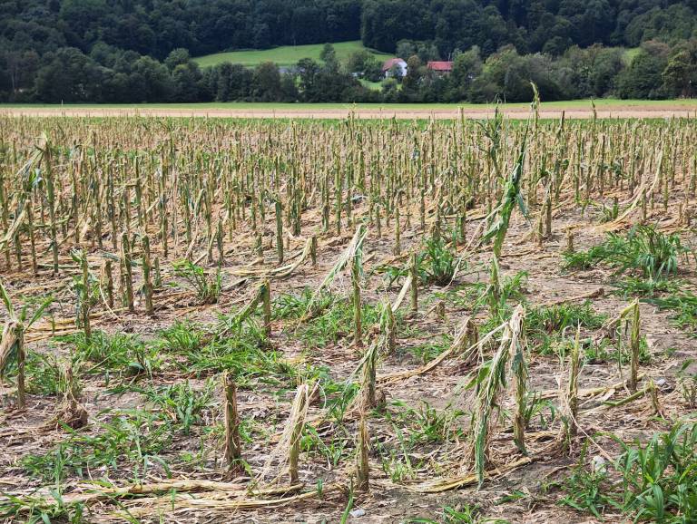 »Ta koruza je bila že normalne velikosti tik pred metličenjem, pred cvetenjem in že po debelini stebel se vidi, da to ni bil samo orkanski veter in neurje, ampak je klestila toča, drugače bi bilo samo polomljeno,« je razložil Perko.