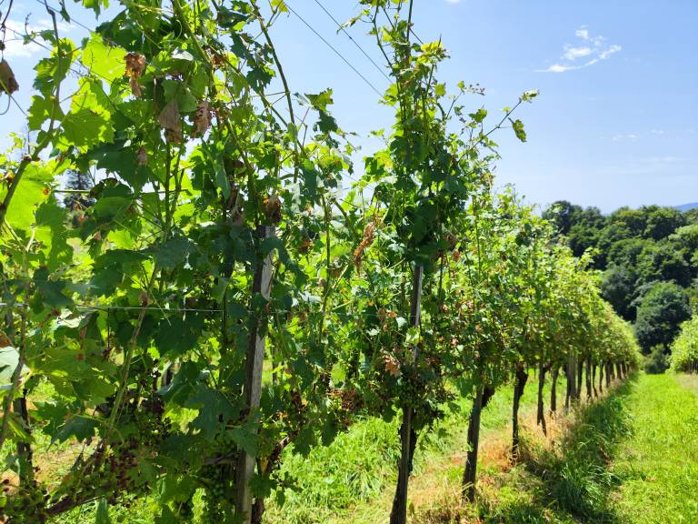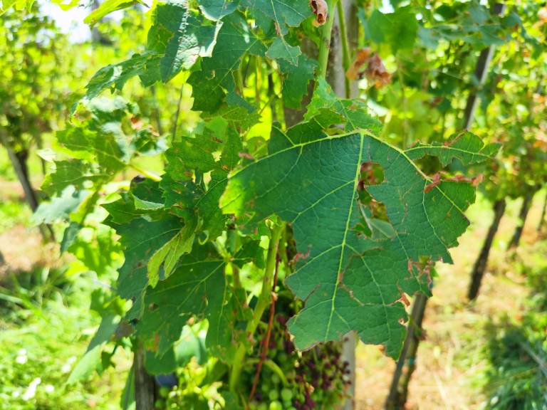 Podobnim prizorom je priča tudi prenekateri vinogradnik. Boštjan Bračko nam je pokazal uničene liste in posušene grozdne jagode.