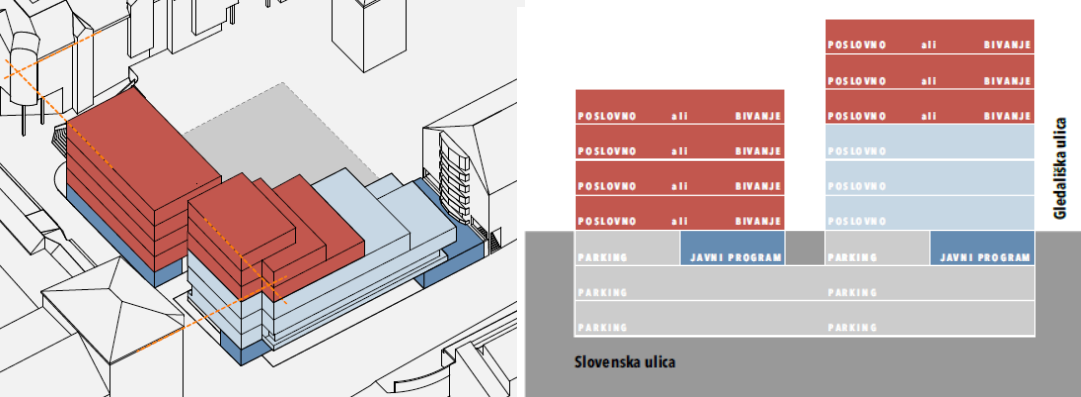 »Obe stavbi se lahko po potrebi v kletnih etažah povežeta s skupno garažo. Stavbi pa s svojo stavbno maso zapolnjujeta in definirata stavbni blok,« je zapisano v osnutku ureditve.