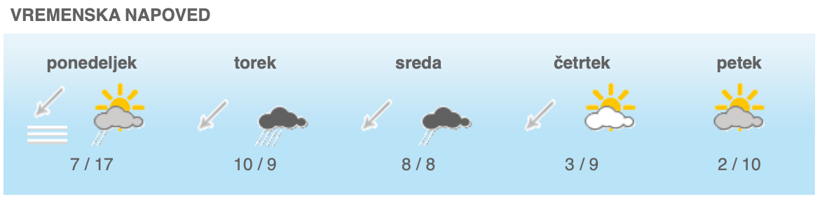 Jutri bo oblačno, občasno bo deževalo. Zvečer se bo meja sneženja spustila do okoli 1400 metrov nadmorske višine. Pihal bo severovzhodni veter, burja na Primorskem se bo popoldne krepila. Temperature bodo od 7 do 11, na Primorskem od 12 do 16 stopinj Celzija.