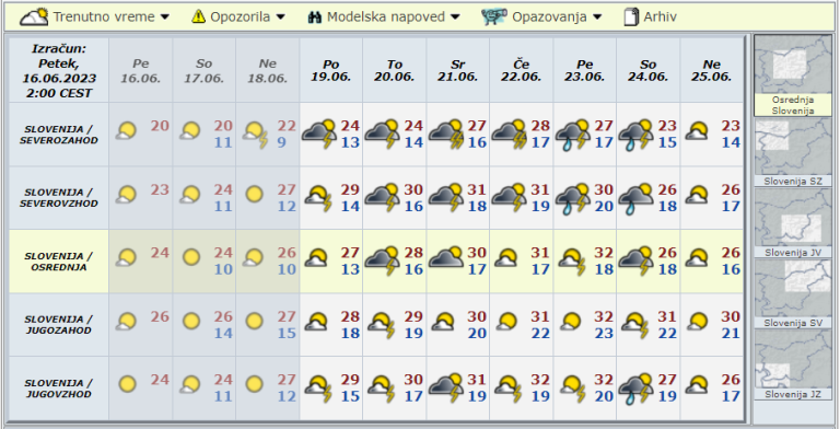 Glede na modelsko napoved za naslednjih deset dni, ki so jo pripravili pri Agenciji za okolje Republike Slovenije, bo najbolj vroče v jugozahodni, jugovzhodni ter osrednji Sloveniji, kjer bodo temperature več dni zaporedoma vztrajale pri 32 stopinj.