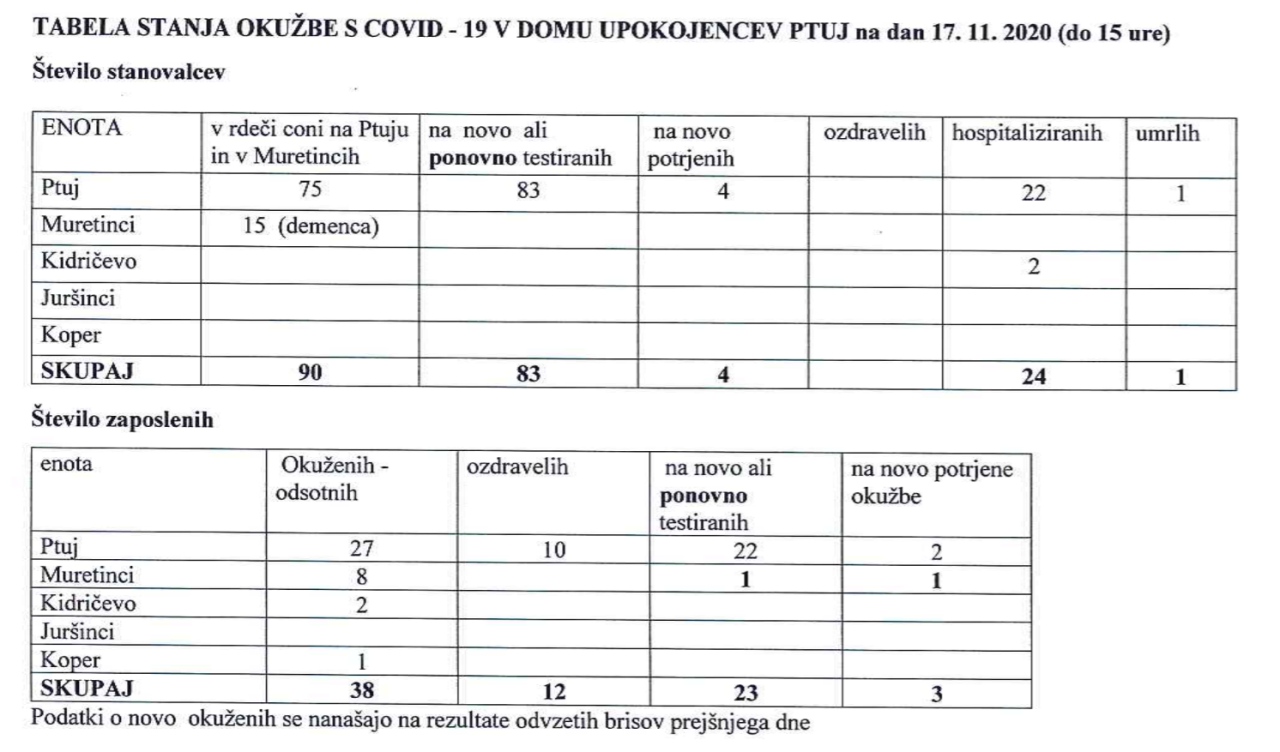 Okužbe s koronavirusom so doslej potrdili v enotah Ptuj, Kidričevo in Muretinci. V enoti Koper je okužena samo ena zaposlena oseba. V enoti Juršinci okužbe doslej niso zaznali.