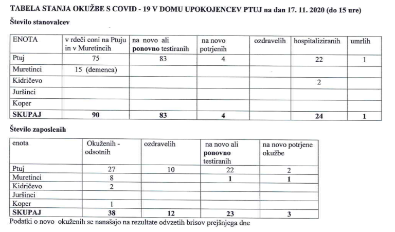 Včeraj, 17. novembra 2020, pa so našteli 114 okužb pri stanovalcih in 38 pri zaposlenih, skupno torej 152 primerov.