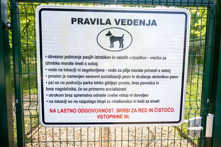 Spomnimo. V parku se psi lahko gibljejo prosto, brez povodca in brez nagobčnika, če so primerno socializirani. Lastniki psov morajo v parku obvezno pobirati pasje iztrebke in ostale odpadke.