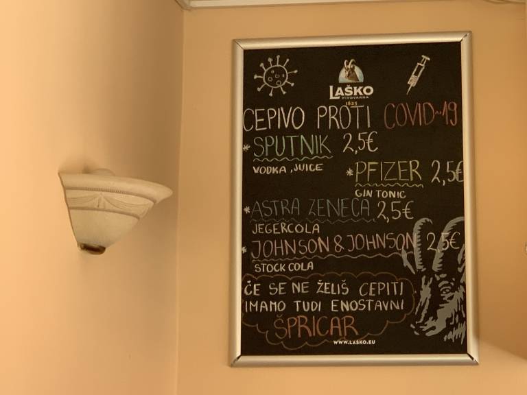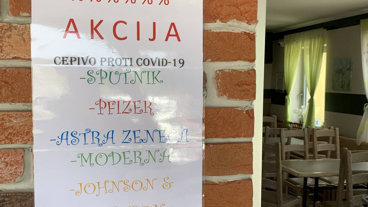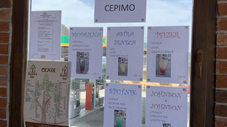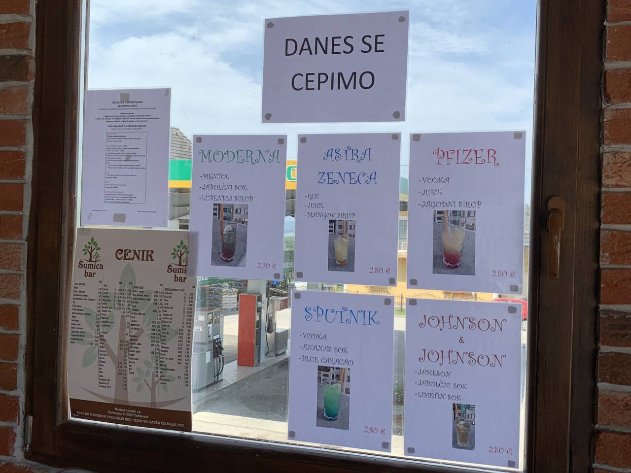 Tudi v gostinskem lokalu v Cerkvenjaku je akcijska ponudba, poimenovana po farmacevtskih podjetjih, kar pa večine ne prepriča, da bi se cepila s pravimi cepivi.