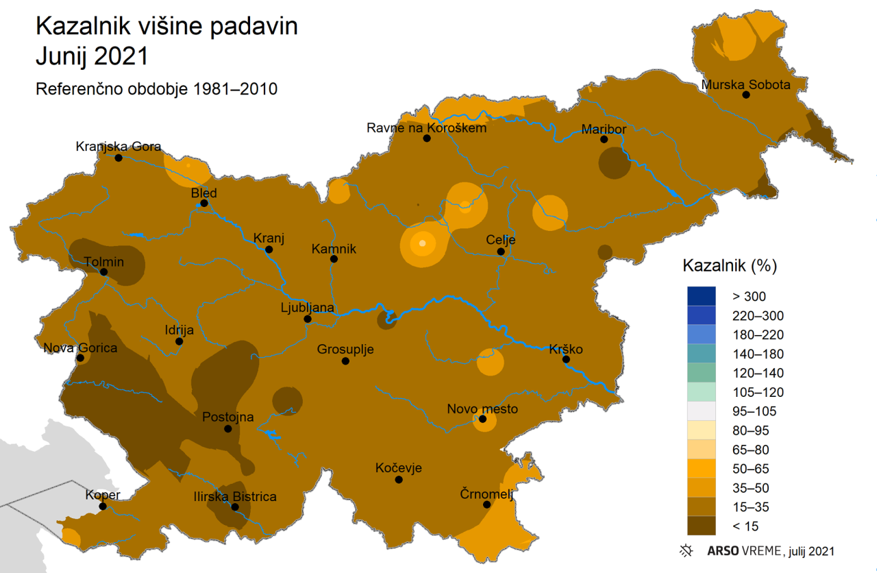 Zgornja fotografija prikazuje kazalnik višine padavin junija 2021 glede na povprečje tridesetletnega referenčnega obdobja 1981–2010. Upoštevano je sorazmerno majhno število merilnih postaj, saj za številne postaje še niso izračunali dolgoletnega povprečja ali podatki v času nastanka poročila še niso bili na voljo.