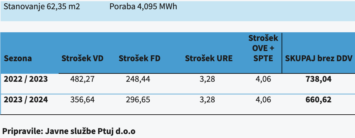 Kot primer so podali primerjalno analizo ogrevalnih sezon 2022/2023 in 2023/2024 na primeru stanovanja površine 62,35 kvadratnega metra s povprečno porabo 4,095 megavatne ure.