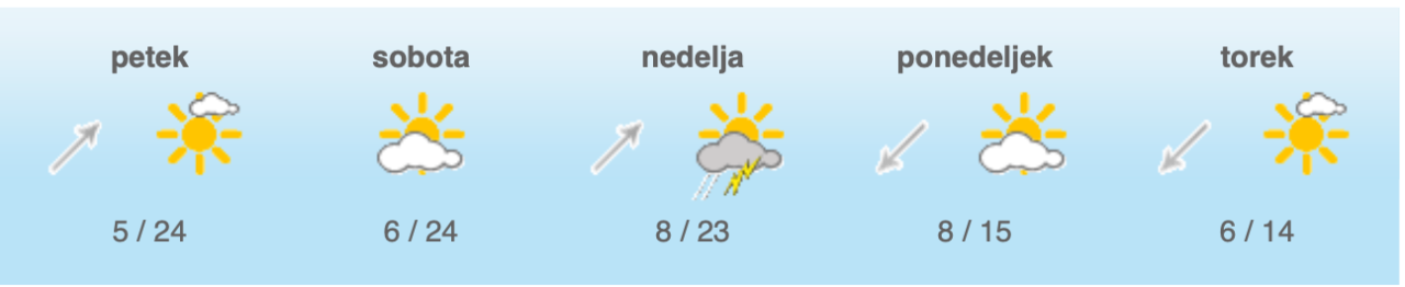 V nedeljo bo dopoldne še dokaj sončno, popoldne pa se bodo začele pojavljati krajevne padavine, predvsem plohe in posamezne nevihte. Dopoldne bo pihal jugozahodni veter, ob prehodu hladne fronte pa bo zapihal okrepljen severovzhodni veter.