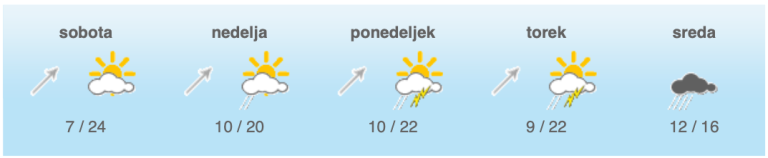 V notranjosti Slovenije bodo nastale posamezne kratkotrajne plohe. Pihal bo jugozahodni veter, le na Štajerskem in v Prekmurju bo popoldne zapihal severni veter. Najvišje dnevne temperature bodo od 20 do 25 stopinj Celzija.