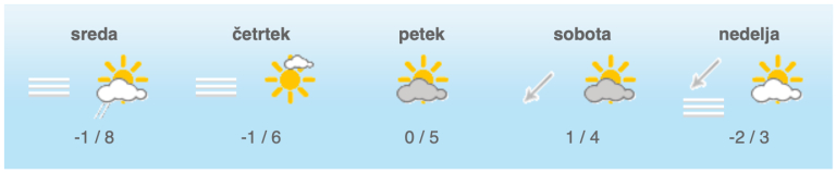 Po poročanju državni meteorologov bodo jutranje temperature od -5 do 0, ob morju okoli 4 stopinj Celzija.