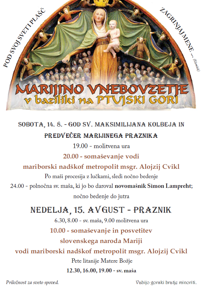 Na Ptujski gori praznovanje Marijinega vnebovzetja ostaja. V soboto, 14. avgusta, bodo v župniji praznovali god sv. Maksimilijana Kolbeja in predvečer Marijinega praznika.