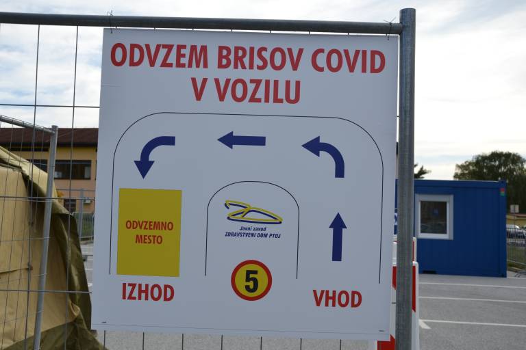 Odvzem brisa se jemlje kar iz vašega avtomobila. Šotor, kjer odvzemajo brise, je postavljen na parkirišče Zdravstvenega doma Ptuj. S puščicami je označeno gibanje avtomobilov, ki je krožno. Pacienti tako ne izstopajo iz avtomobilov, saj je bris odvzame kar skozi okno avtomobila.