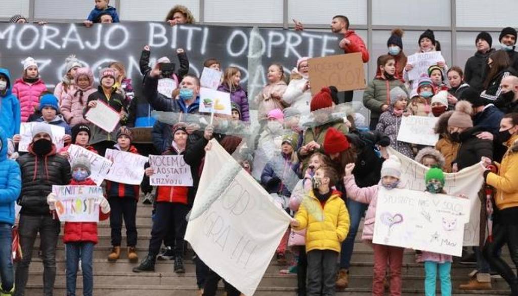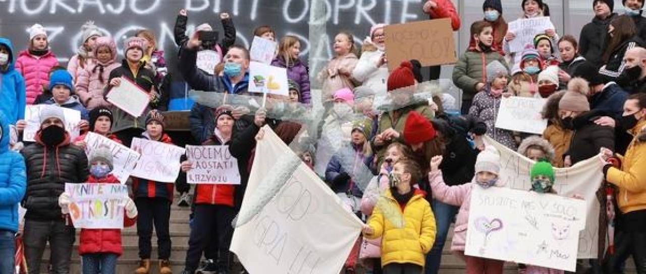 Protesti zaradi zapiranja šol v regijah s slabšo epidemiološko sliko so se po sobotnem protestu v Trbovljah danes nadaljevali v številnih krajih po državi. Tudi v Mariboru.