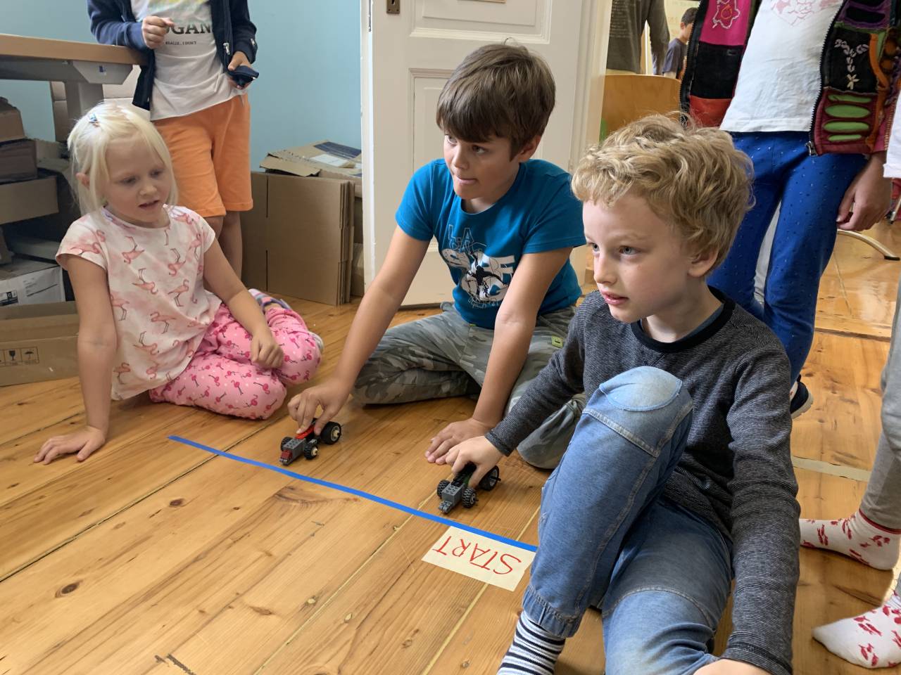 Sestavljanju avtomobilčkov je sledil preizkus hitrosti na pravem testnem poligonu in vzkliki: »Tri, štiri, zdaj! Tooo!«