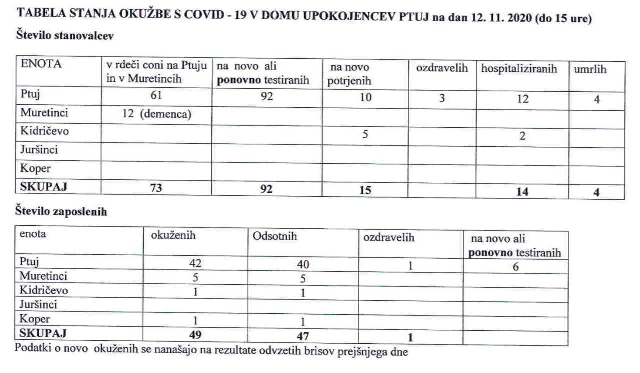 Dan zatem, torej včeraj, 12. novembra 2020, so se številke okužb povzpele na 87 stanovalcev in 49 zaposlenih.