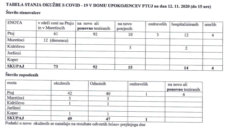 Poročali smo že, da je bilo v sredo, 11. novembra 2020, v Domu upokojencev Ptuj s koronavirusom okuženih 76 stanovalcev in 47 zaposlenih.