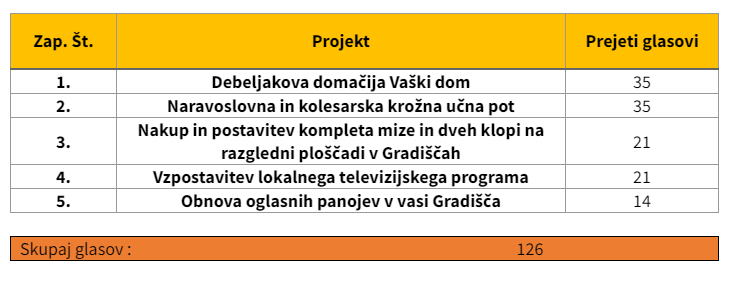 Prepričana je, da bosta lahko izvedena tudi projekta Obnova oglasnih panojev v vasi Gradišča in Nakup in postavitev kompleta mize in dveh klopi na razgledni ploščadi v Gradiščah.