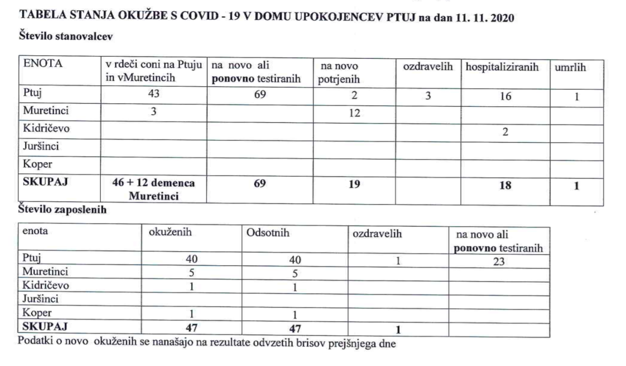 Dan zatem, torej včeraj, 11. novembra 2020, so se številke povzpele na 76 okuženih stanovalcev in 47 okuženih zaposlenih.