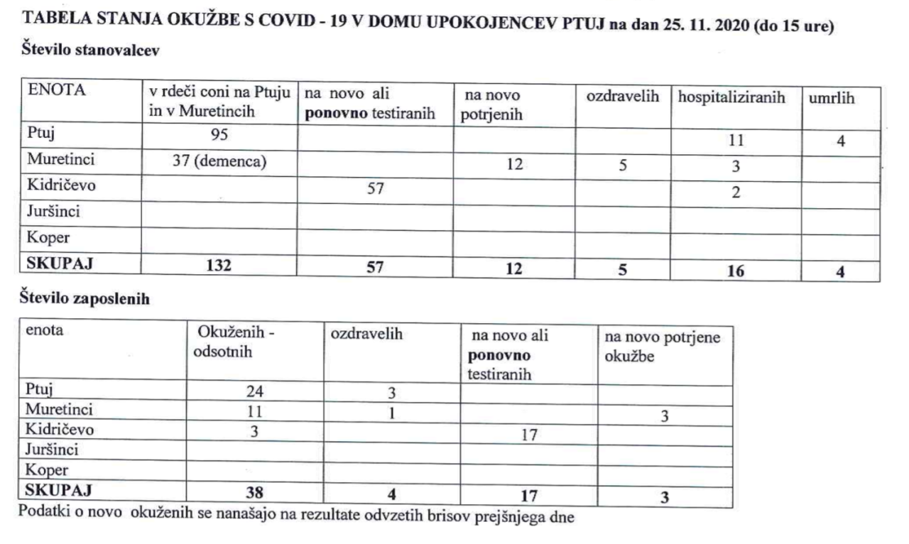Včeraj, 25. novembra 2020, pa so bile okužbe potrjene pri 148 stanovalcih in 38 zaposlenih.