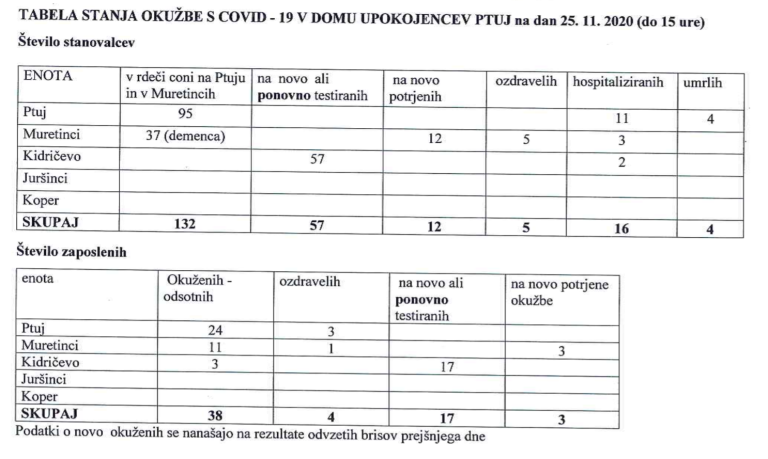 V torek, 24. novembra 2020, je bilo v Domu upokojencev Ptuj s koronavirusom okuženih 145 stanovalcev in 38 zaposlenih.