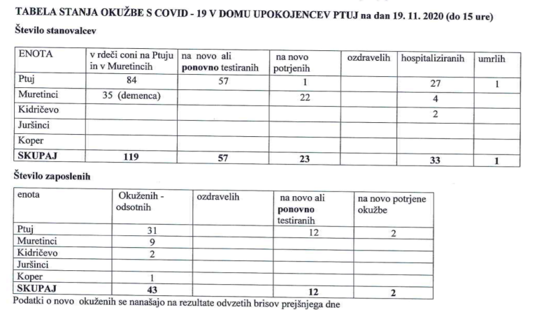 V rdečo cono za osebe z demenco v Muretincih so včeraj namestili 20 na novo okuženih stanovalcev. Direktorica Doma upokojencev Ptuj Jožica Šemnički je povedala: »Preseneča nas dejstvo, da so bili vsi ti stanovalci prvič testirani pred enim tednom, 10. novembra, in so bili negativni. 18. novembra so bili ponovno testirani in je bila okužba potrjena pri 22 stanovalcih. Vsi so bili asimptomatski, pri prvem in drugem testiranju.«