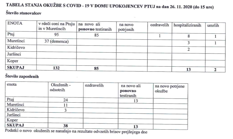 Včeraj, 26. novembra 2020, pa so bile okužbe potrjene pri 145 stanovalcih in 38 zaposlenih.
