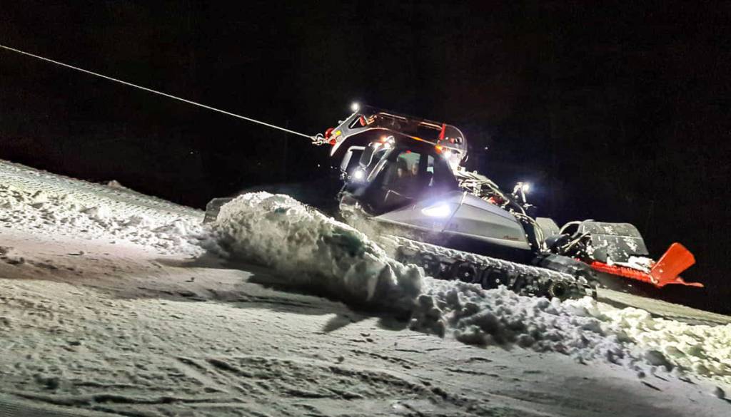 V Kranjski Gori je po deževnem zalivanju proge zapadlo pol metra snega, ki so ga vso noč obdelovali s teptalci.