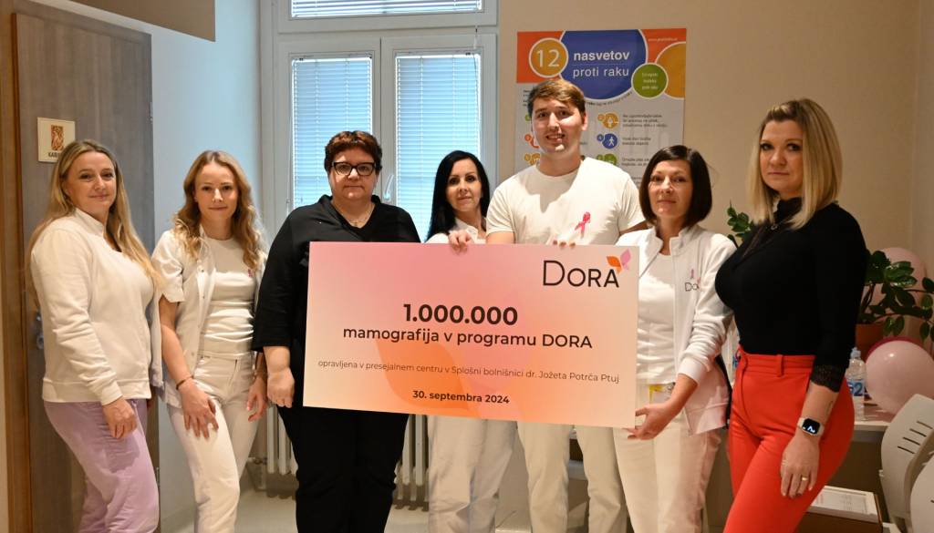 V ptujski splošni bolnišnici je s sodelavci presejalnega centra programa DORA in gospo, pri kateri so opravili milijonto mamografijo, potekala obeležitev tega pomembnega mejnika v programu DORA, ki se po doseženih kazalnikih kakovosti presejanja za raka dojk uvršča v evropski vrh.
