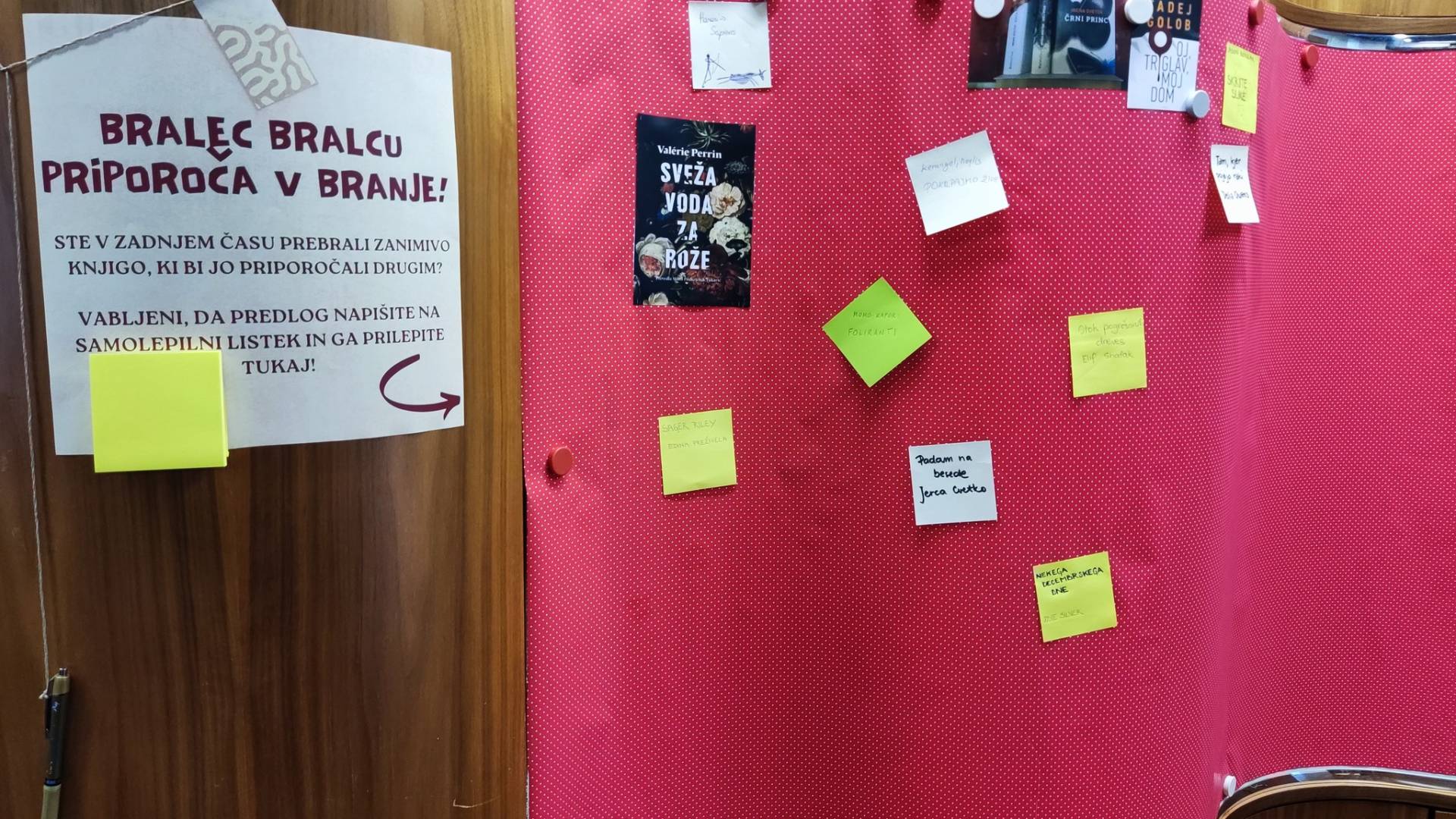 Na list zraven oglasne deske so zapisali: »Bralec bralcu priporoča v branje! Ste v zadnjem času prebrali zanimivo knjigo, ki bi jo priporočali drugim?«