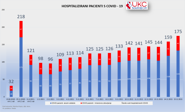 Številke se bliskovito višajo, je opozoril tudi strokovni direktor mariborskega kliničnega centra Matjaž Vogrin. Hospitaliziranih je 175 covidnih pacientov, od tega jih je 42 na intenzivi: »Skoraj smo dosegli nivo drugega in tretjega vala.« Povprečna starost bolnikov na akutnem oddelku znaša 69,1 leto, na intenzivnem oddelku pa 65,9 let.