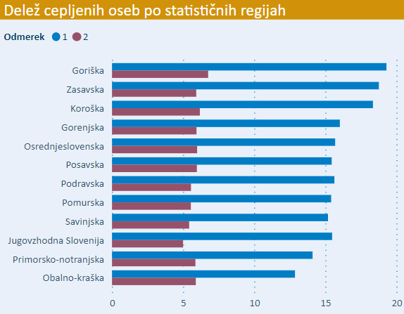 Da gre za nekoliko zaskrbljujoče stanje, kažejo nadaljnji podatki, ki prikazujejo, da je bilo z drugim odmerkom cepljenih samo 5,8 odstotka prebivalcev Slovenije, kar je zelo malo od napovedane 60-odstotne precepljenosti prebivalstva. Pri tem je najboljša Goriška regija, ki je s prvim odmerkom cepila 19,29 odstotka občanov, Goriški regiji, pa sledijo Zasavska, Koroška in Gorenjska.